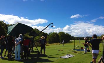 カメラクレーンはティーオフの場面で利用していますが、穴井プロの迫力あるスイングを撮らえています。(高額な)カメラに向かってスイングをしていたので、ボールが当たったらどうしよう、、、と内心心配していましたが(笑)、さすがにプロの弾道はきれで、そんな心配は不要でした!!